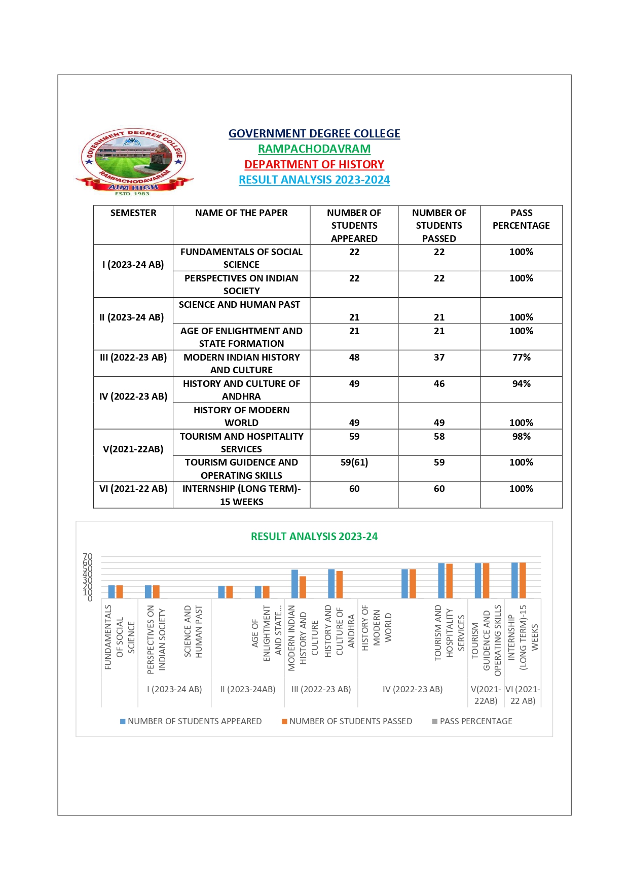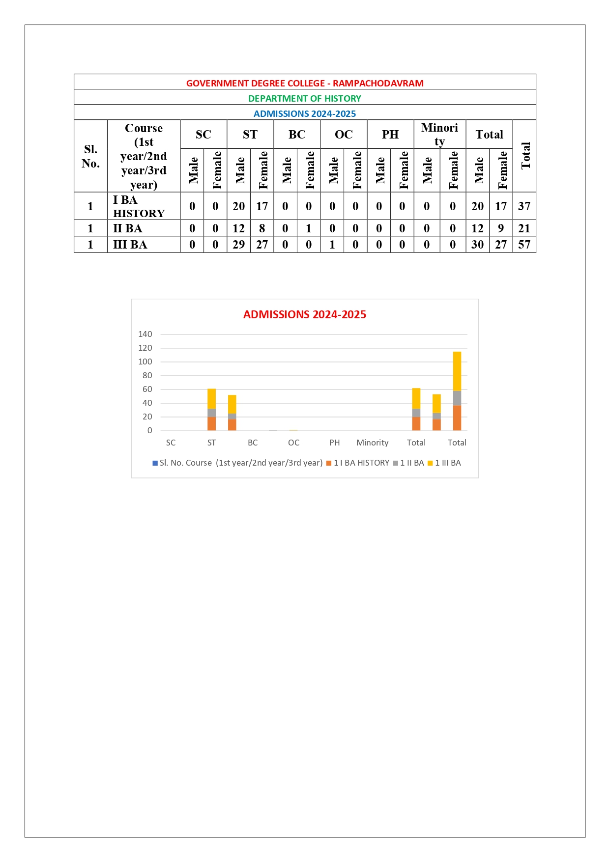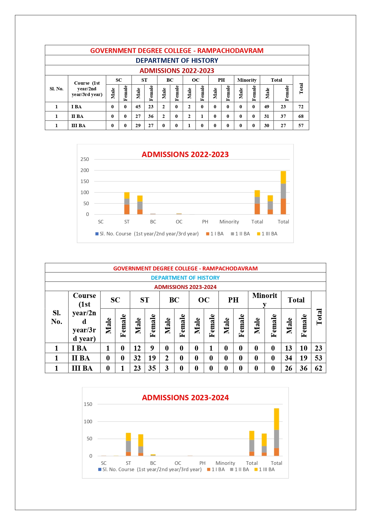 Established in the academic year 1983-84, the Department of History was one of the founding department of the Govt. Degree College, Rampachodavaram. It is having approximately 113 students. Every year, History outgoing students got B.Ed and P.G entrance test ranks. HEP programme was introduced in 1983 with Telugu medium. History cluster system was introduced in 2017-2018. The Department of History at Government Degree College, Rampachodavaram, has evolved significantly since its inception, recently introducing a dedicated major in history to accommodate growing interest in the discipline. In 2023, the college formally established the major system for History with an initial intake capacity of 40 students. Currently, there are 40 students enrolled in the first year of the history major, and 21 students in the second year. Meanwhile, 52 third-year students are enrolled in the History, Economics, and Political Science (HEP) combination.The department emphasizes a well-rounded educational approach, organizing a variety of activities aimed at enhancing both academic and personal development. Among these initiatives are student seminars, quizzes, guest lectures, and peer-learning sessions, all of which encourage students to engage deeply with historical content and improve their critical thinking and public speaking skills. Project work is also integrated into the curriculum, allowing students to conduct research, work collaboratively, and present their findings, thereby gaining hands-on experience in historical inquiry and analysis.These educational practices contribute to the overall development of students, equipping them with a deeper understanding of history and essential skills in research, analysis, and communication. The department’s efforts to create a stimulating academic environment underline its commitment to fostering an engaging and supportive learning community. A National webinar was also conducted in the month of January 22,2022.